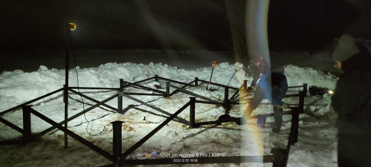 Расчистили снег на участке, выполнили монтаж с усилением фундамента с помощью диагональных раскосин. Раскосины приваривали с торца, а не сбоку от ствола сваи, для обеспечения правильного распределения нагрузки.